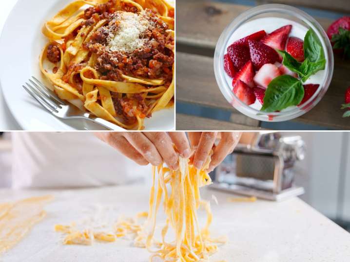To start, you'll learn to make the perfect homemade Caesar salad from scratch to serve alongside expertly-seasoned warm garlic bread. Then, you'll roll up your sleeves to make fresh pasta dough by hand, shaping it into long fettuccine ribbons and smothering your noodles in a hearty Bolognese sauce. For dessert, indulge in a decadent panna cotta with the sweet flavors of vanilla bean.