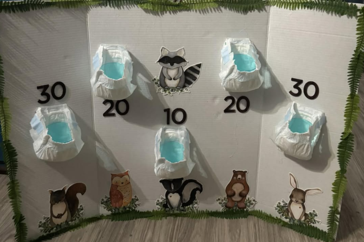 This one works especially well when both parents are involved. A diaper-themed spin on a familiar party game, it keeps things playful while letting mom and dad jump in together.
