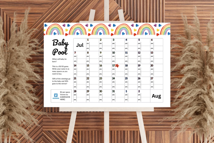 A classic for celebrating the parents-to-be. Guests place predictions on the baby’s arrival, and the final results often become a keepsake mom and dad look back on after the baby arrives. You can even guess the time of day and the length and weight of the baby. Whoever is the closest wins.