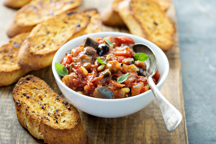 This Sicilian-inspired dish adds bright flavor to your spread. Roasted eggplant, bell peppers and tomatoes come together with a touch of sherry vinegar for a sweet-savory mix that’s delicious over crostini. Serve over crackers or slices of baguette for a delicious hors d'oeuvre.