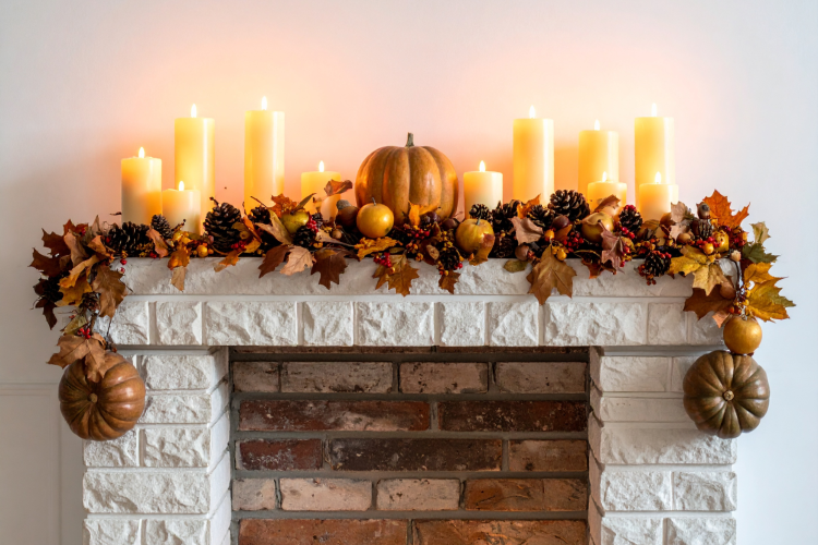 If you have a fireplace mantel in your living room, it’s a great opportunity to fill it with fall fireplace decor accents like leaf garlands, fall florals, candles and other seasonal decor in various heights and levels. You can even add some twinkle lights amid the leaves for a little sparkle to your Thanksgiving decoration ideas. Keep flammable décor a safe distance from open flame.