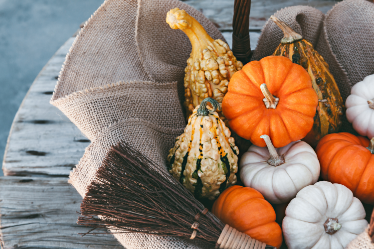 Gourds already read as seasonal, so pile mixed shapes in a bowl or basket for an easy, natural fall centerpiece or paint them to match your palette with colors like white or gold.