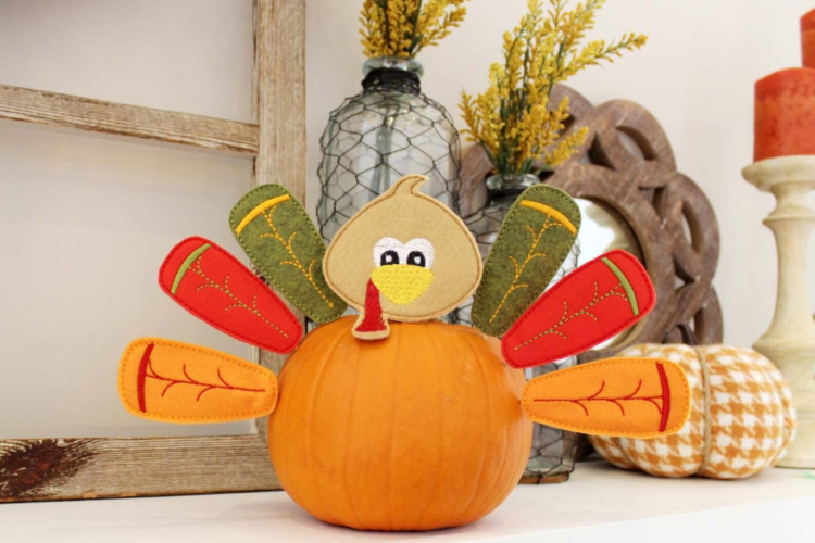 You can create a fabulous giant turkey centerpiece using a regular pumpkin. Use toothpicks with a dab of glue to add corn stalks and ears of decorative corn that look like feathers around the back. Place fruit around the base and add berries and other edible ingredients to the beak and eyes.