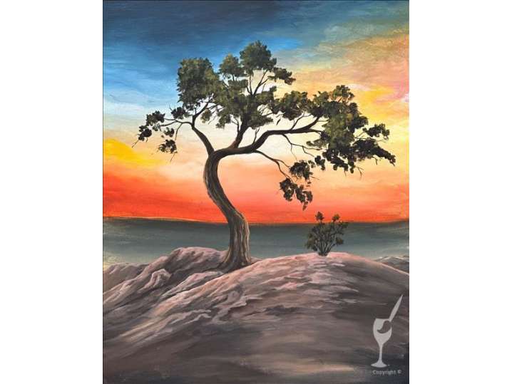 A single tree grows majestically from a rocking cliff with a colorful sunset and calm waters in the background are the subject of this engaging paint and sip class.