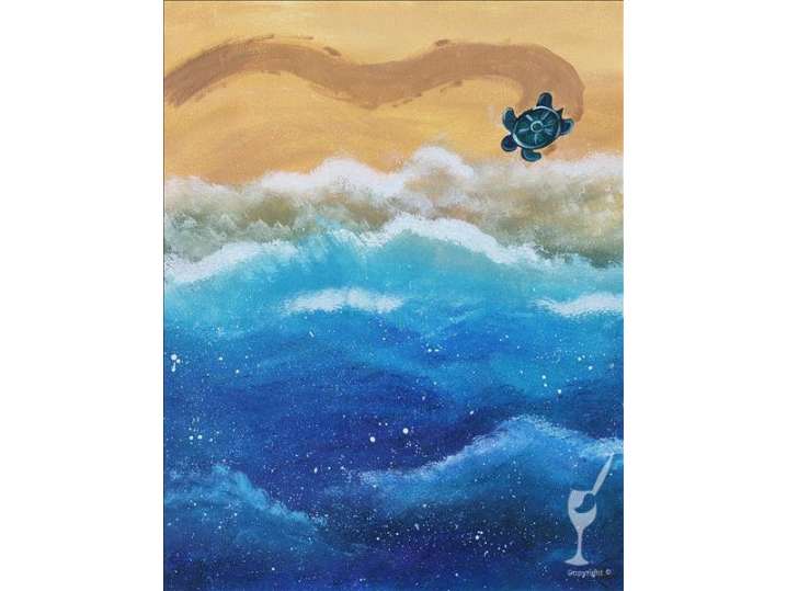 A newly-hatched baby sea turtle makes its way across the sand and into the refreshing salty ocean waves in this fun paint and sip class.