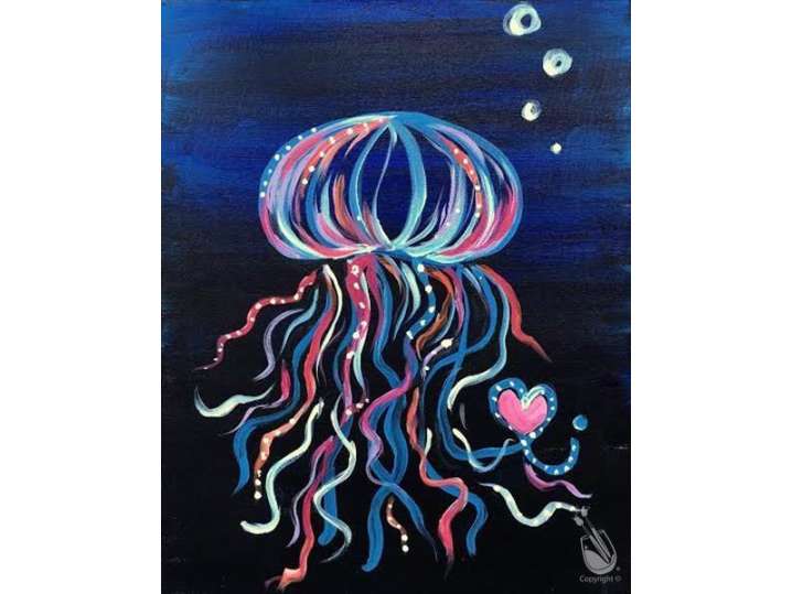 Paint a portrait of joyous jellyfish floating through a dark blue ocean and making bubbles in this engaging pint and sip class.