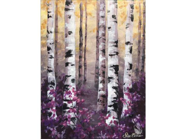 Paint a landscape of majestic birch trees with delicate purple flowers growing at their base in this engaging paint and sip class.