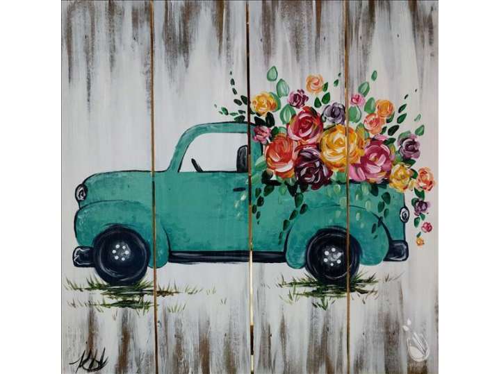 Car enthusiasts and floral fans unite in this paint and sip session, where you'll create a rustic, detailed truck that's carrying a stunning bouquet of sprightly flowers.