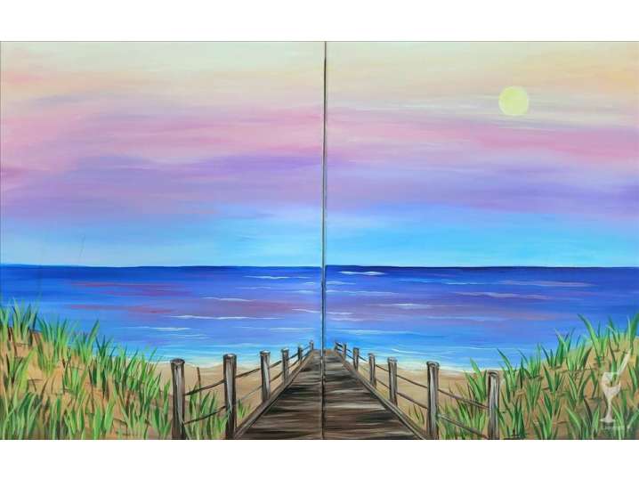 Paint a beach landscape featuring a sun setting in a colorful sky over a bright blue ocean with a boardwalk bordered by sand dunes on two canvases in this date night paint and sip class.