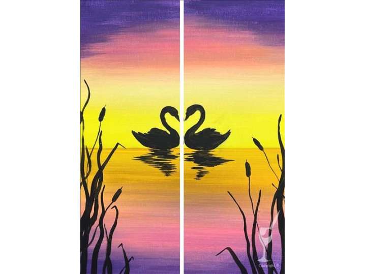 A contrasting and warm sunset surrounds two swans forming a love heart in a tranquil lake for this paint and sip session.