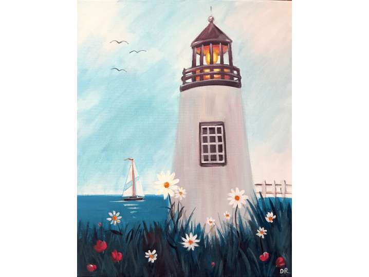 A tranquil lighthouse stands tall, keeping an eye out for danger on behalf of sailors as it is surrounded by the sea and flowers in this paint and sip class.
