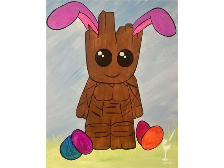 Paint a cute bunny-looking figure with warm eyes, a cute smile and eggs around it in a paint and sip session.
