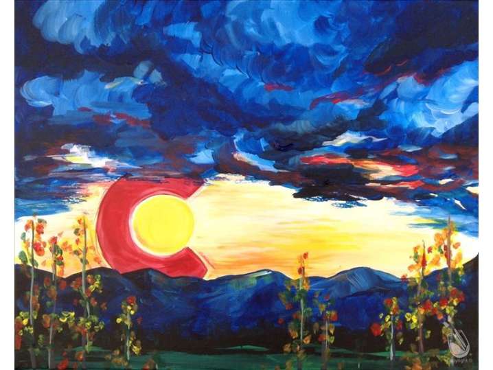 Enjoy paint and sip session as you create a stunning landscape of Colorado in blue and yellows with a bright red “C” cradling the settling sun.