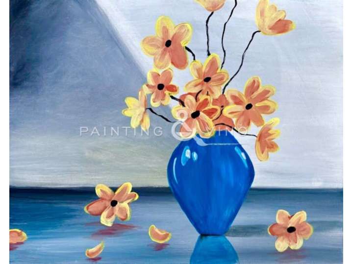 A bright blue vase full of sunny yellow and orange flowers sits on a blue-hued landing in front of a misty gray background in this lovely paint and sip session.