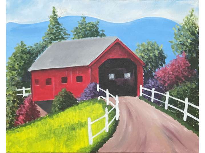 A red-covered bridge sits on a quiet country road in this fresh, springtime paint and sip session.