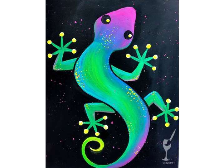 A sly gecko slithers its way up the canvas, lighting up its path with neon colors in this paint and sip class.