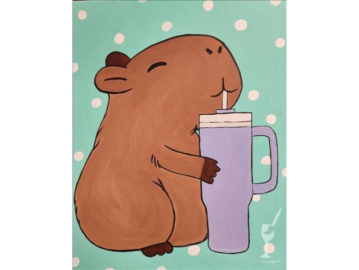 A Joyous capybara is drinking something tasty amongst a spotty background for this paint and sip class.