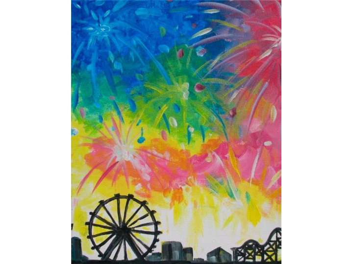 Delight in recreating this vibrant image of fireworks exploding through the sky above a Ferris wheel in this paint and sip class.