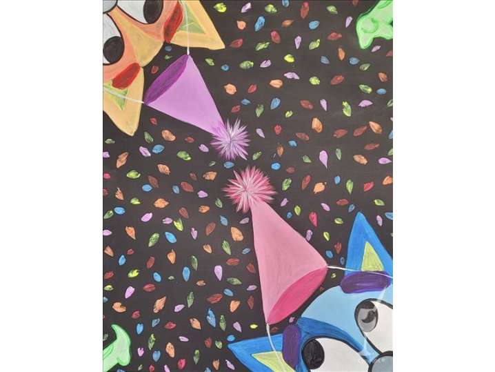 During this paint and sip class, you'll create an adorable painting of two party dogs, complete with party hats and festive details, bringing joy and celebration to your canvas.