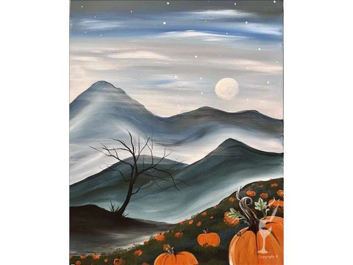 A fog blankets the mountains, rolling in to greet a pumpkin patch in this paint and sip class.