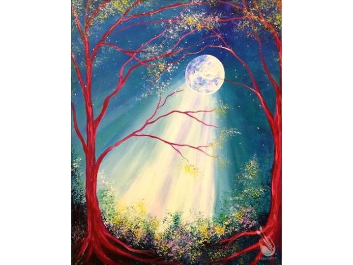 Paint a radiant moon illuminating the earth and awakening a wildflower field in this dramatic paint and sip class.