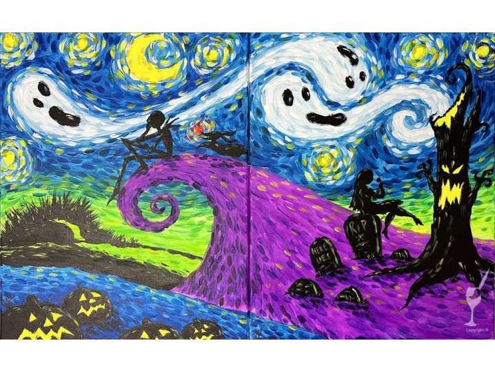 Join this paint and sip class to capture the eerie beauty of starry night glowing ghosts, set against a mesmerizing, celestial backdrop.