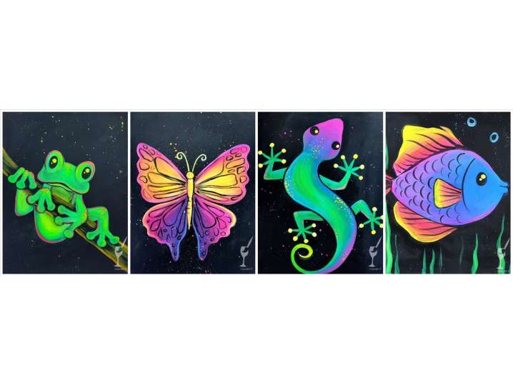 In this family-friendly paint and sip class, create vibrant, glowing canvases featuring a whimsical assortment of frogs, butterflies and fish that shine brightly under blacklights for a magical and interactive experience.