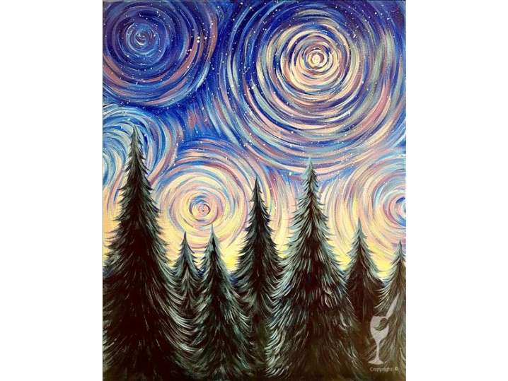 Join this whimsical paint and sip class to create a mesmerizing forest painting featuring vibrant swirls in the sky, where you'll blend colors and textures to capture the enchanting movement of nature and the magical energy of the scene.