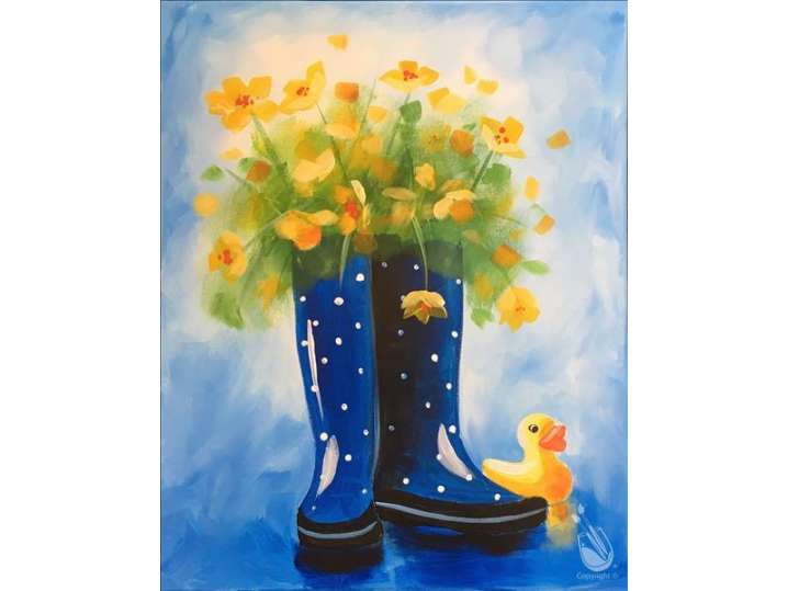 In this paint and sip class, create a charming painting of rain boots filled with bright yellow flowers, symbolizing beauty in unexpected places.