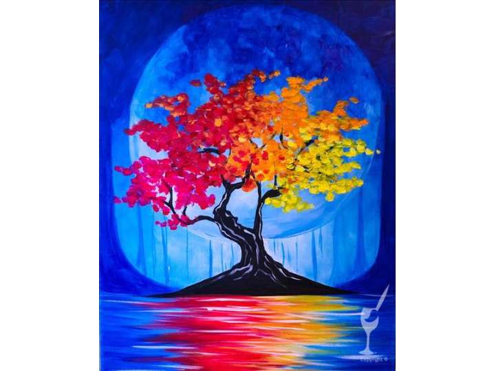 Paint and Sip: Colorful Tree Reflection Scene