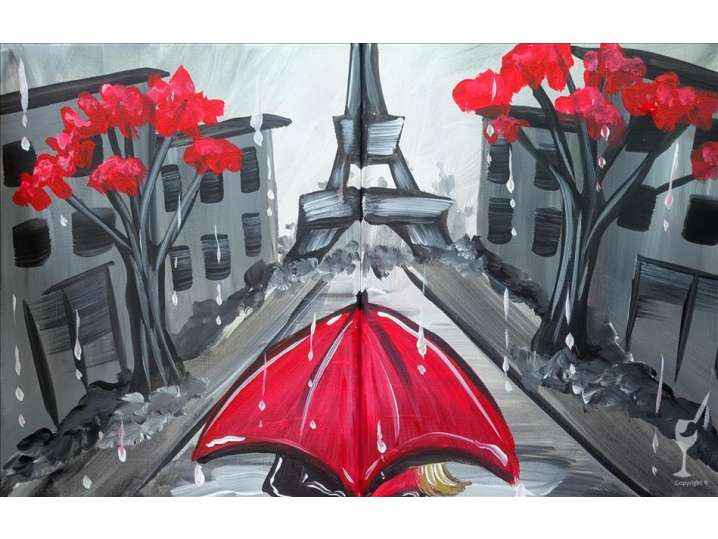 Paint a rainy cityscape inspired by Paris, centered around a bold red umbrella and moody reflections in this paint and sip class.