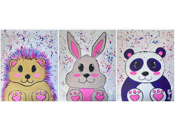 Paint a playful set of bright, cartoon-style animals with fun splatter details in this paint and sip class.