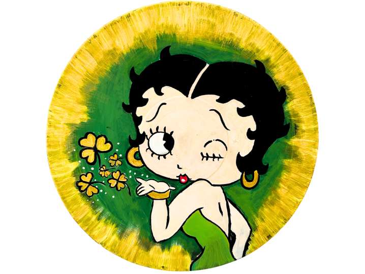 Create a playful Betty Boop blowing a kiss with clovers floating in the air in this fun and lucky-themed paint and sip class.