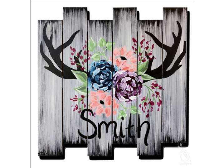 Join this BYOB paint and sip class to create this personalized rustic artwork complete with bloom-adorned antlers.